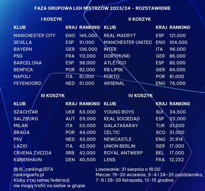W pierwszym koszyku znaleźli się mistrzowie 7 najlepszych lig z rankingu UEFA po sezonie 2022/2023 oraz Sevilla FC, triumfator Ligi Europy z poprzedniego sezonu.